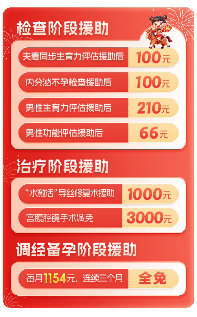 为切实缓解不孕不育家庭的经济压力,郑州慈善总会送子公益基金为来院患者提供“优生及不孕普查保障型援助”和“疑难性不孕深度帮扶服务”。患者只需报名登记,即可通过免申报、直接补贴的便捷服务,实现从检查到治疗的全程减负,让求子之路更宽敞。点击在线咨询,免费申请补助